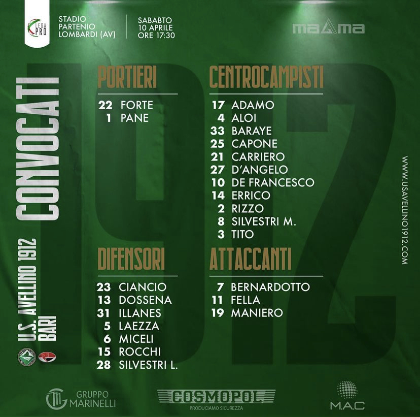 Ecco la lista degli uomini a disposizione di mister Braglia per l’incontro contro il Bari: