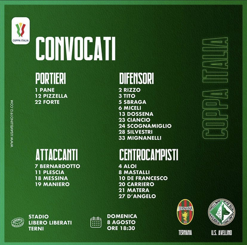 Ecco i convocati di mister Braglia per la sfida alla Ternana valevole per il primo turno di coppa Italia: