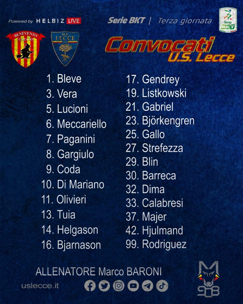 Il Lecce ha comunicato la lista ufficiale dei convocati in vista della sfida di campionato del “Vigorito” contro il Benevento che si disputerà domani sera alle ore 20:30.