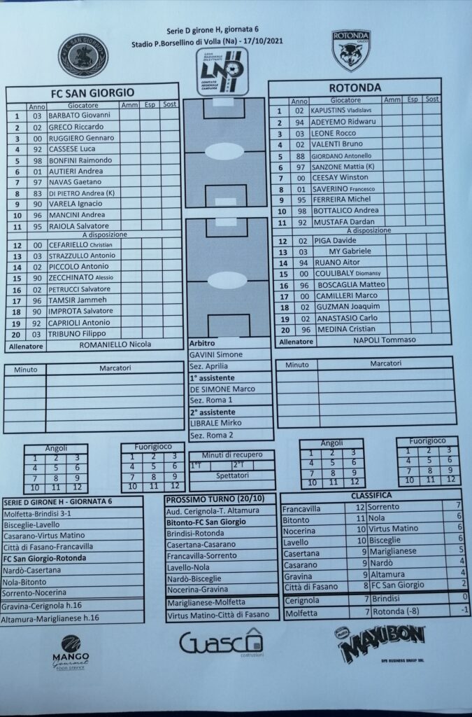 Sono stati annunciati i 22 titolari che scenderanno in campo al “Paolo Borsellino” di Volla per il match San Giorgio – Rotonda: