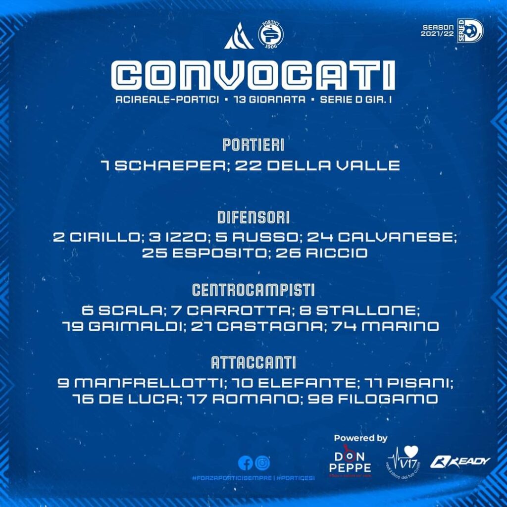 È stata resa nota la lista dei convocati del Portici di Sarnataro in vista della sfida contro l’Acireale, valevole per la 13^a giornata di serie D, girone I: