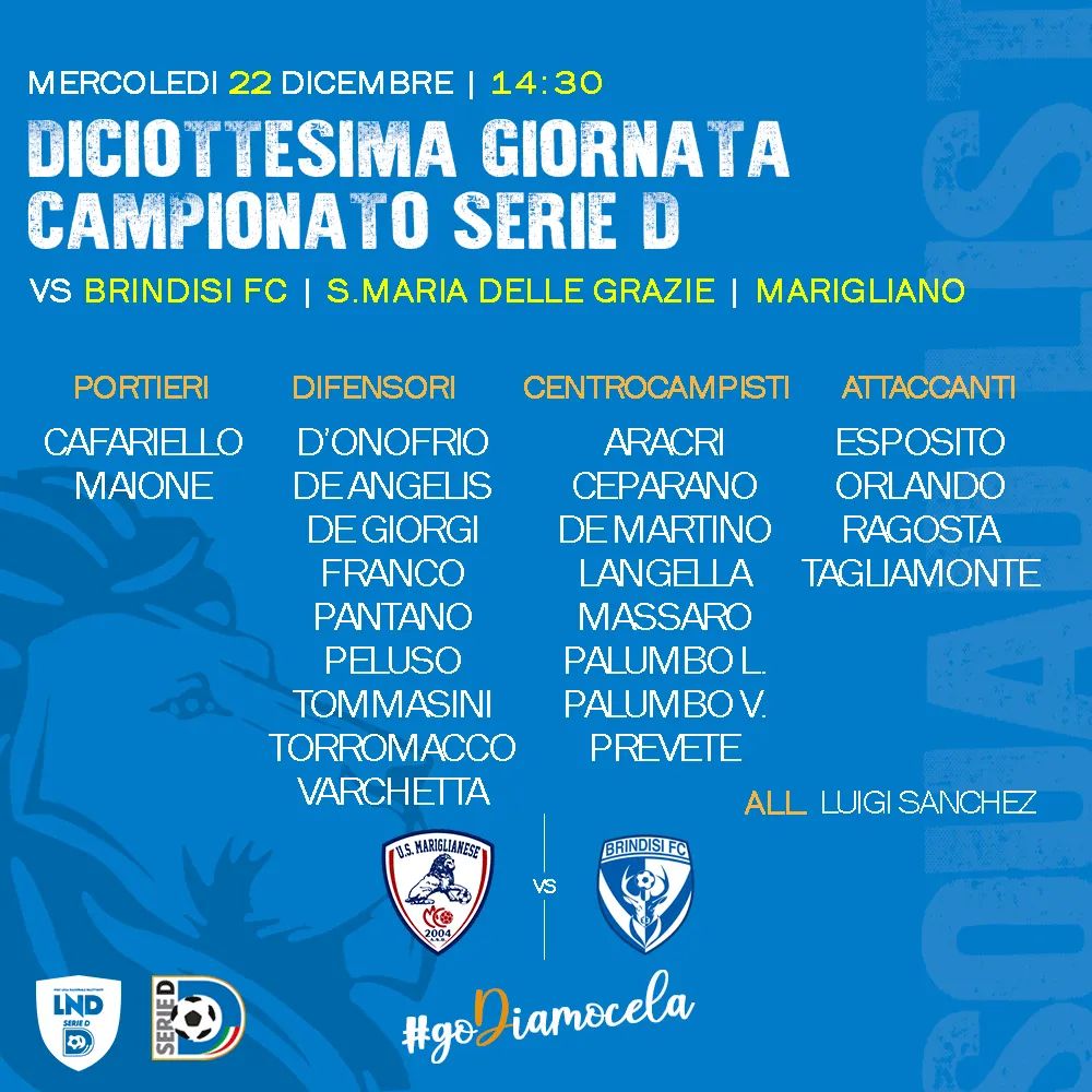 Archiviata la storica vittoria di Nocera della diciassettesima giornata di Serie D Girone H, la Mariglianese si proietta al turno infrasettimanale contro il Brindisi che chiuderà questo indimenticabile 2021 del club biancoazzurro. Di seguito, riportiamo la lista dei calciatori convocati dal tecnico Sanchez: