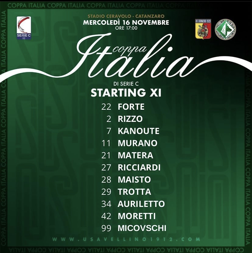 Ecco l’11 titolare scelto da mister Rastelli per la sfida tra Catanzaro e Avellino valida per la Coppa Italia di Serie C: