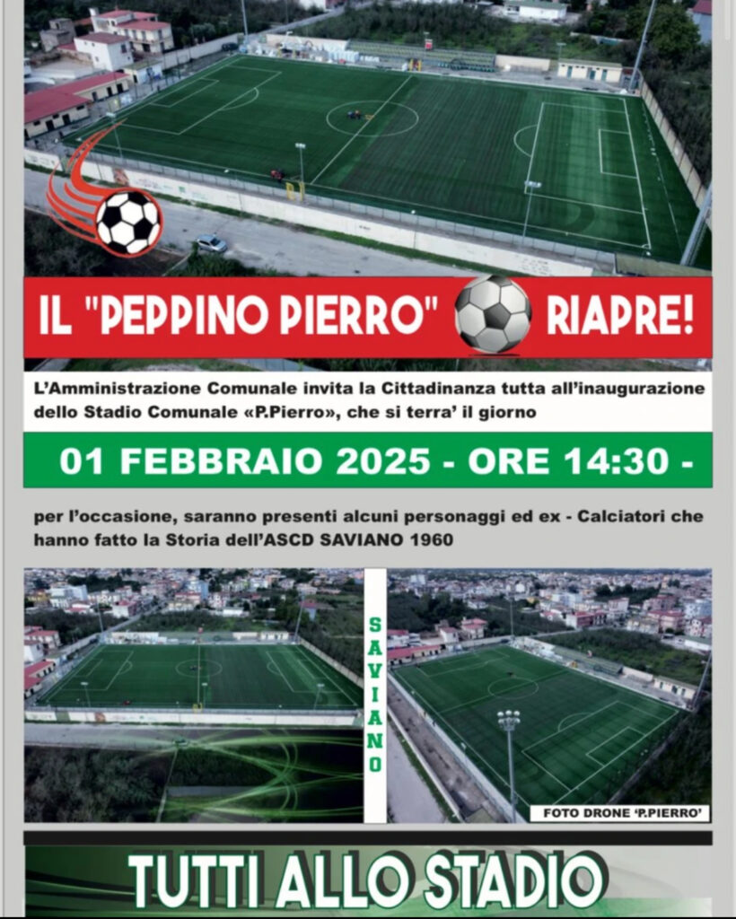 Buone notizie per i tifosi del Saviano. È tornato agibile, dopo i lavori di rifacimento che hanno impiegato diversi anni, lo Stadio Comunale “Peppino Pierro” di Saviano. Una notizia che riempirà sicuramente di gioia i supporters neroverdi che dopo anni passati sulle gradinate del Comunale di Ottaviano potranno tornare nella loro “casa”. L’inaugurazione dell’impianto avverrà alle ore 14:30 del 1º Febbraio 2025. Per l’occasione saranno presenti diverse vecchie glorie del calcio dilettantistico che hanno avuto l’onore di calcare il manto erboso del “Peppino Pierro”, la rosa savianese che, nella stagione 1997/98, partecipò agli spareggi contro la Palmese e tanti altri.