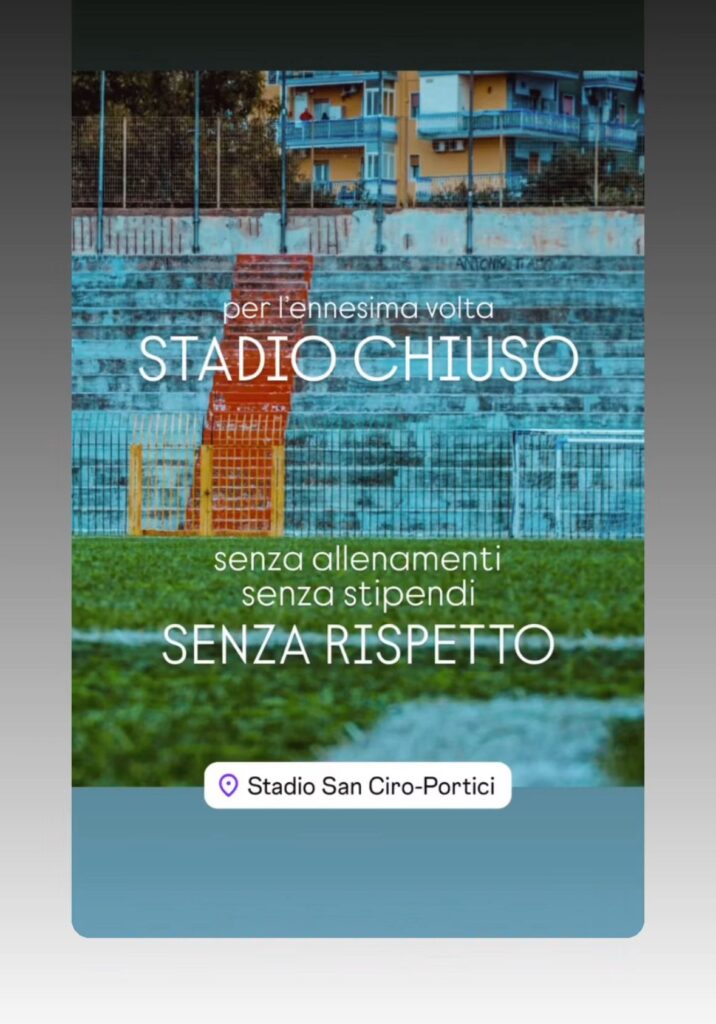 Nonostante le buone prestazioni del Portici allenato da mister Carannante, con lanconquista di tre vittorie consecutive dopo il pari di Quarto – Frocalcio, Virtus Afragola e Sant’Anastasia -, la situazione societaria interna parrebbe tutt’altro che felicemente distesa. Una storia pubblicata da Flavio Marzullo, vice allenatore di Carannante insieme a Giuseppe Costagliola, lancia l’allarme sulle dinamiche interne della società porticese. Nella foto, pubblicata su Instagram e repostata anche da alcuni calciatori come ad esempio Filogamo e Marotta, sullo sfondo del «San Ciro» si legge: «Per l’ennesima volta stadio chiuso, senza allenamenti, senza stipendi, senza rispetto».