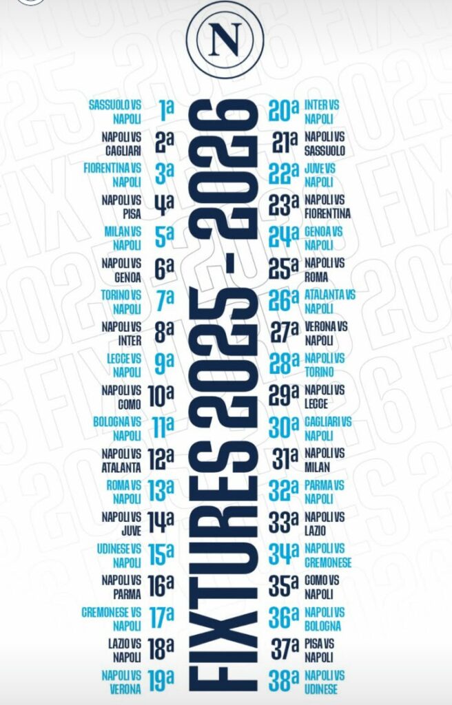 Al Teatro Regio di Parma si è tenuto il sorteggio del calendario della Serie A 2025/2026, che avrà inizio nel weekend del 23 e 24 agosto. Il Napoli Campione d’Italia esordirà al Mapei Stadium di Reggio Emilia contro il Sassuolo ed alla seconda giornata affronterà la prima partita stagionale al Maradona proprio contro il Cagliari, esordendo dunque a Fuorigrotta contro la compagine affrontata in occasione della gara conclusiva della Serie A 2024/2025 e decisiva per la vittoria del quarto scudetto.