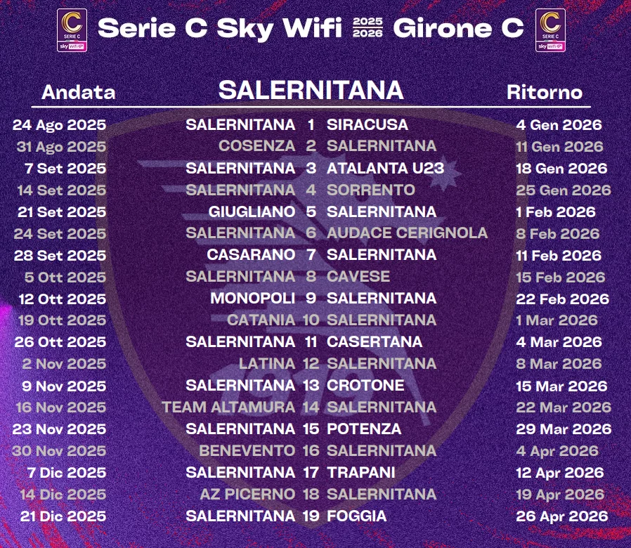 La Lega Pro ha diramato in data odierna i calendari della Serie C Sky Wifi 2025/26. Di seguito il cammino della Salernitana, inserita nel girone C:
